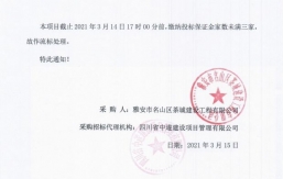 本項目截止2021年2月18日17時00分前,繳納投標(biāo)保證金家數(shù)未滿三家,故作流標(biāo)處理。特此通知!采購人:雅安市名山區(qū)茶城建設(shè)工程有限公司采購招標(biāo)代理機(jī)構(gòu):四川省中遂建設(shè)項目管理有限公司日期:2021年2月20日...